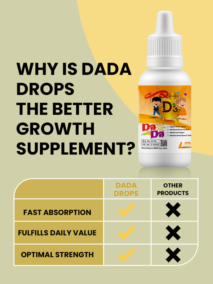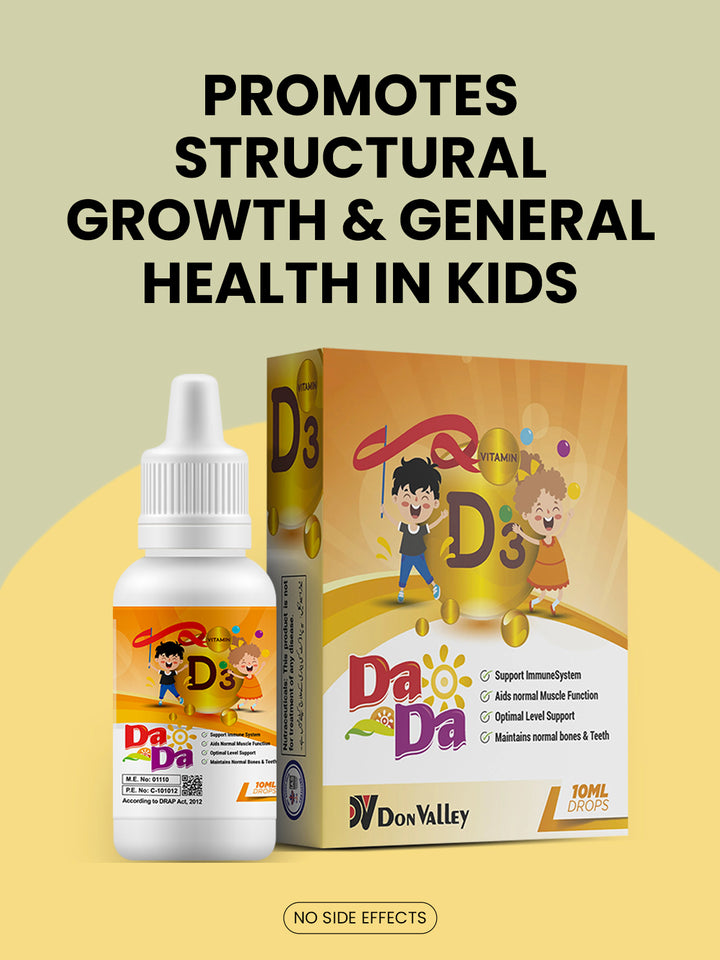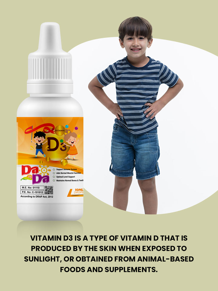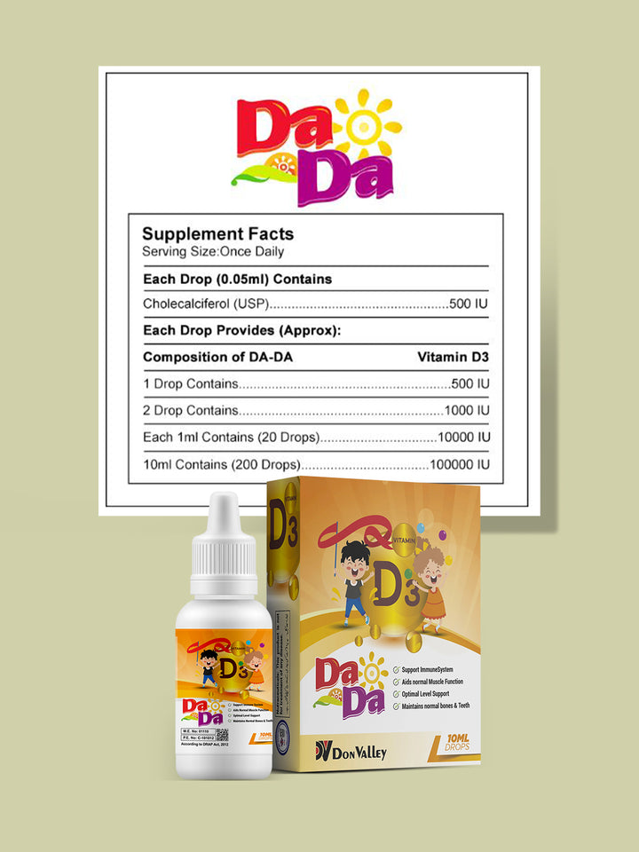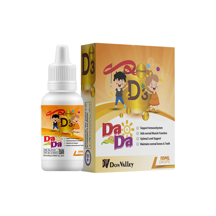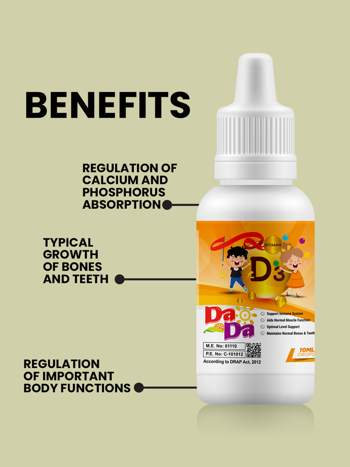 DaDa Drops 10ML is a nutraceutical product that provides both nutrition and medicinal benefits for children. It is a vitamin D3 preparation that supports the structural growth and general health of the body.
