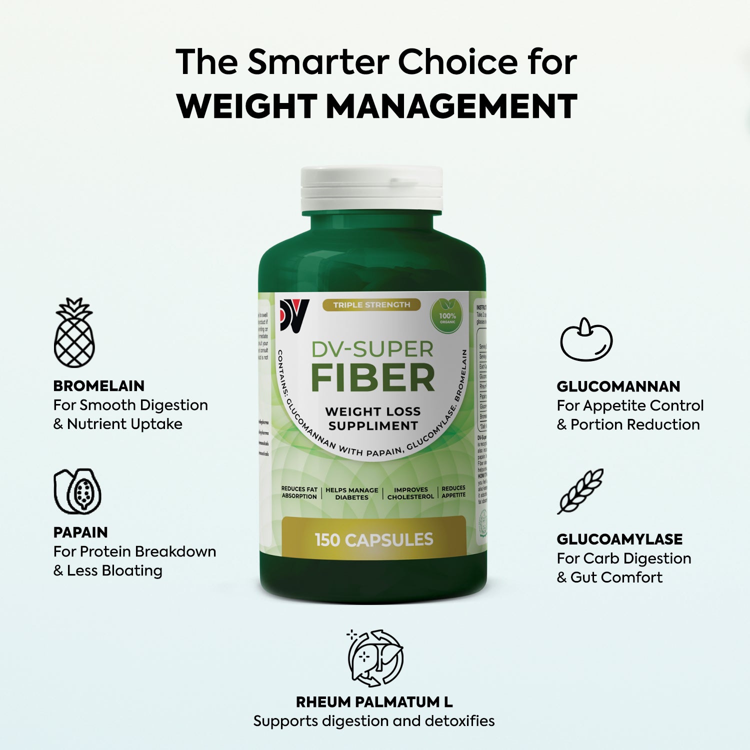DV-Super Fiber is powered by refined Japanese Glucomannan, the world’s most studied and trusted fiber for weight management. It is combined with natural digestive enzymes Bromelain, Papain, and Glucoamylase to help you manage your weight naturally while improving digestion and overall gut health.