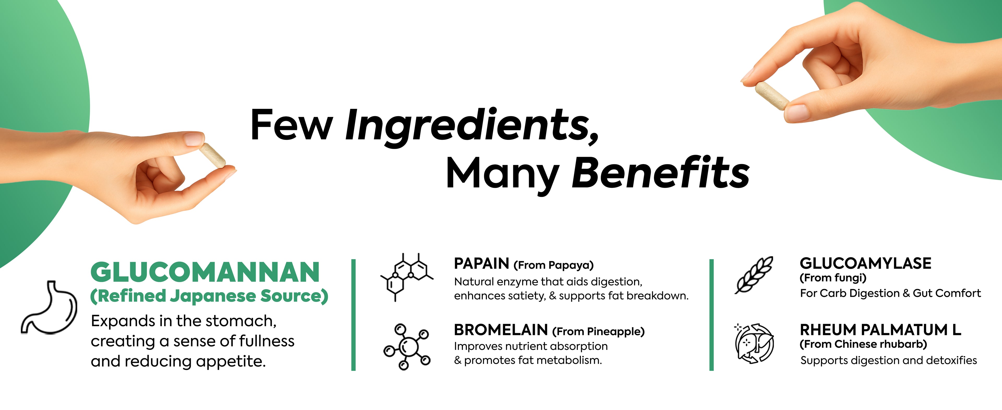 Refined Japanese Glucomannan plus Papain, Bromelain, and Glucoamylase, a clean blend for appetite control and digestion.